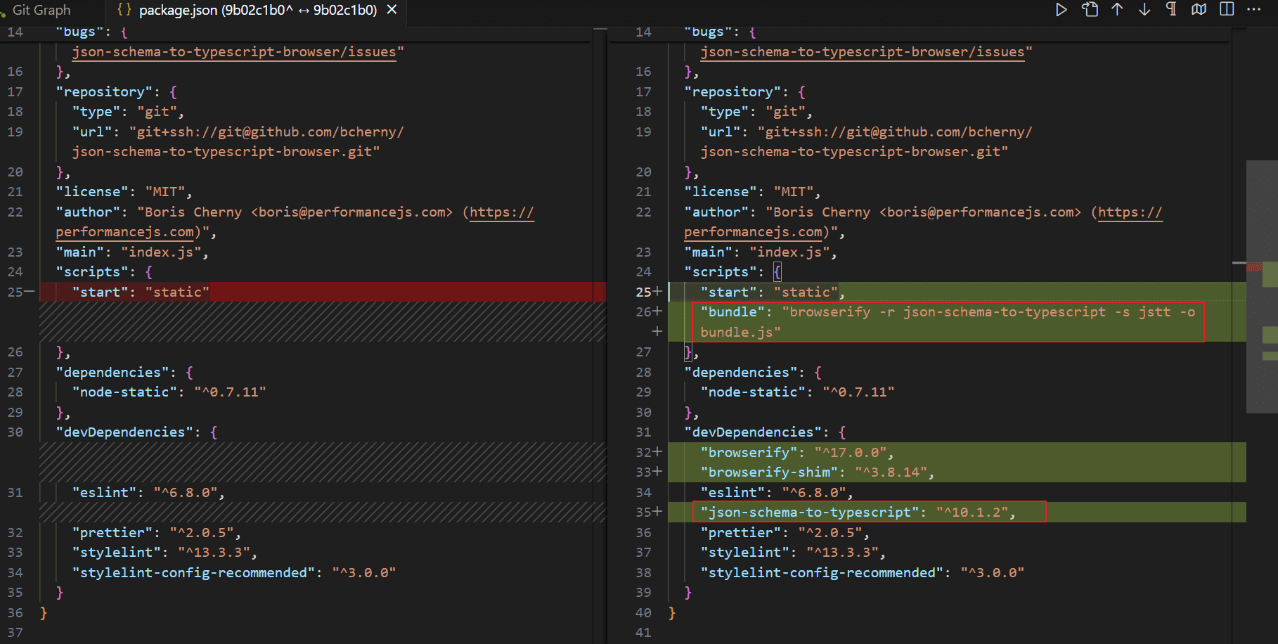 作者把json-schema-to-typescript整个库通过browserify打包了,并命名变量为jstt(所以commit1里的bundle.js可能就是作者用自己电脑打包后加进仓库的,然后又把打包的命令也加到仓库了)。
