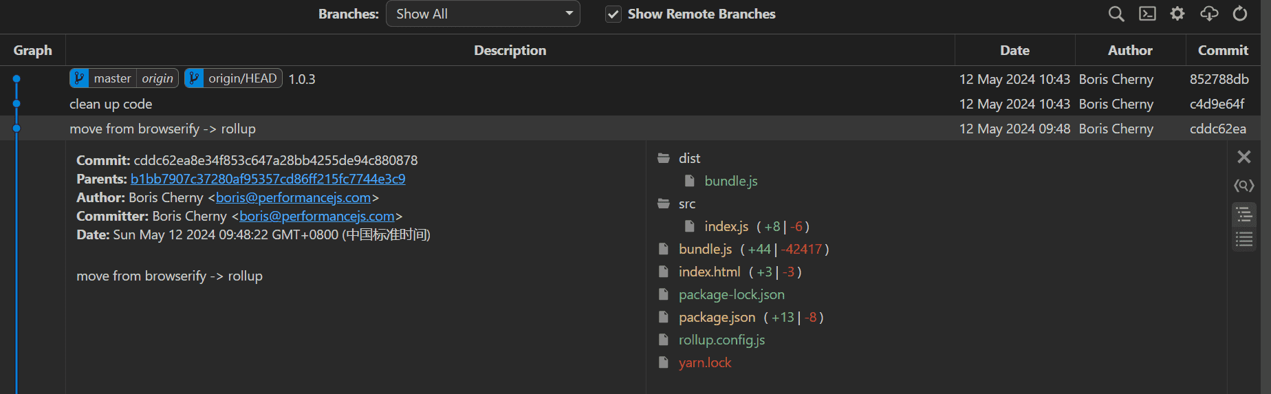 再看一下这条神来一笔的commit,move from browserify -> rollup:
