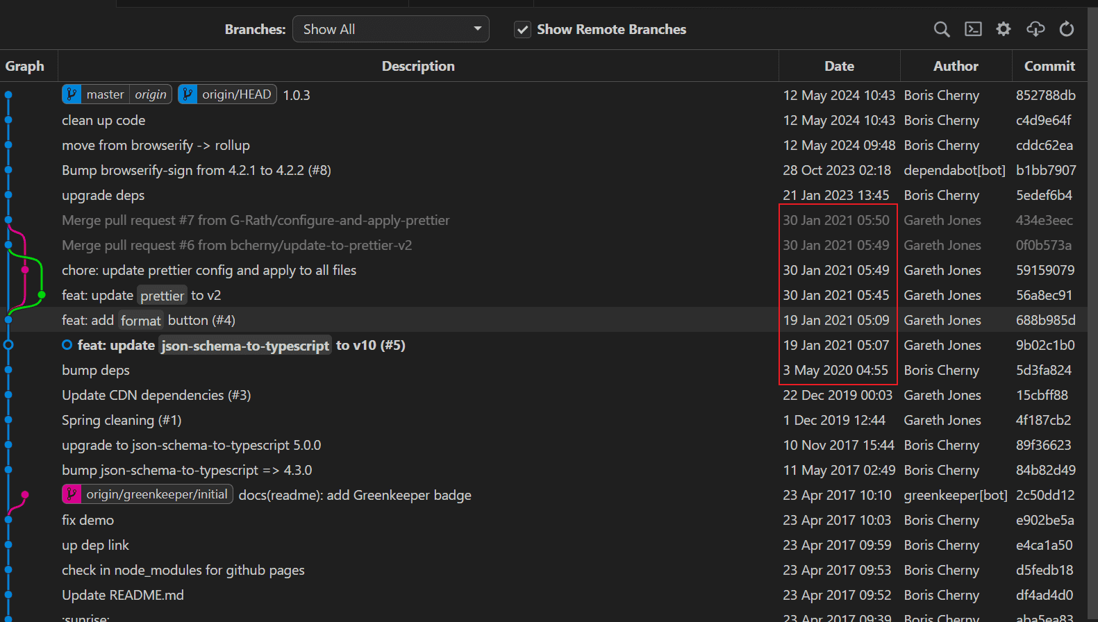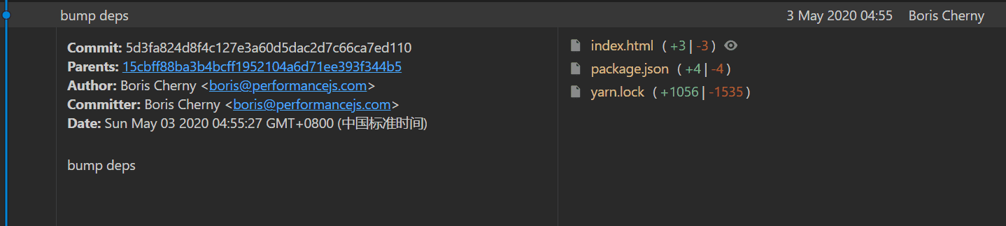 在bump deps这个commit内,看到了静态资源引入,此时作者是Boris Cherny。